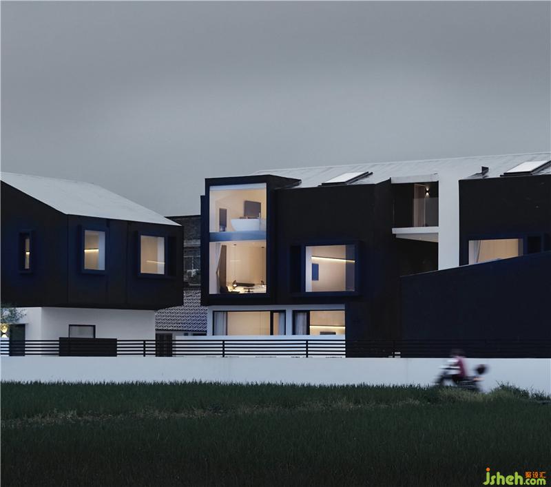設(shè)計之初,希望最終矗立在稻田盡頭的不單單只是個民宿,而是帶有某種精神性感知的建筑物。因此摒棄了傳統(tǒng)民宿的固有概念,選用帶有凝聚性力量的黑色作為建筑的主基調(diào),極簡的建筑形態(tài)與周邊混亂的建筑肌理形成對立美學(xué),以守望者的姿態(tài)出現(xiàn)在稻田盡頭,打開一種全新的日常體驗。