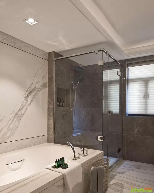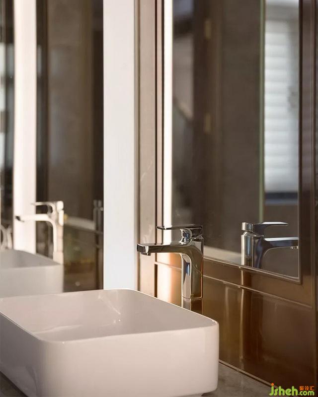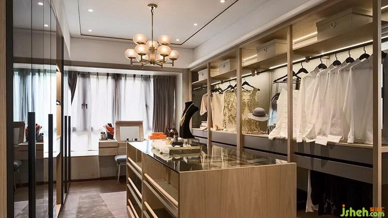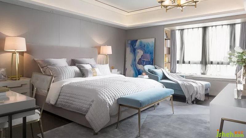 主臥軟裝整體色調(diào)以藍(lán)、灰為主,暖黃色的燈光自上而下調(diào)和著整個(gè)空間的冷暖對(duì)比,乾淨(jìng)、舒適又不失色彩。藍(lán)灰色的貴妃椅和床尾凳,打破了暖調(diào)一致的沉悶,些許顏色的點(diǎn)綴賦予了房間特別的氣質(zhì)。衛(wèi)生間墻面的大理石紋理與色彩,與裝飾畫的搭配,意境很美。衣帽間藏匿著幾分古典優(yōu)雅,原木色的櫃子掩藏著驚人容量的收納。中島柜下鋪陳的灰色拼接混真絲地毯,櫃子明架的暖光讓飾品籠上黃色暈彩,皮具的光澤變得無可挑剔。