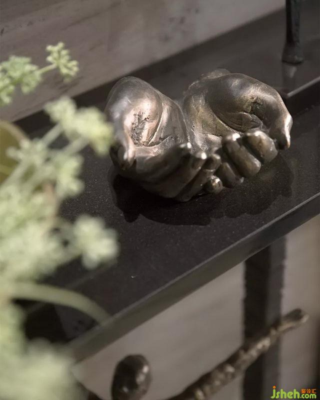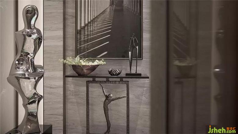 進入玄關(guān),石材與深色玄關(guān)桌冷暖對撞帶來的視覺反差體驗,配上魔幻式的星空玄關(guān)吊燈,增添趣味性。玄關(guān)的異性雕塑形象生動,吸引觀賞者的好奇心,打開生活的無限可能。