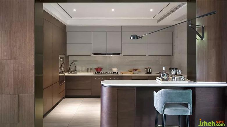 客廳以四米挑高空的優(yōu)勢,簡約內(nèi)斂的手法,調(diào)和高級灰與溫潤棕的木飾面,利用多種不同材質(zhì)組合空間,有光亮的色調(diào)與黯淡的色調(diào)穿插對比。簡約高雅的沙發(fā)和灰白錄拼色地毯相呼應,原裝西班牙Nomom大掛鐘的掛飾手法采用曲線與非對稱線條構(gòu)成,空間的每一處軟裝混搭設(shè)計都恰到好處。開放式餐廳滿足90后熱情好客的生活習慣,餐廳、客廳完全自由連接,環(huán)繞型動線確保各功能區(qū)之間的順暢流轉(zhuǎn),運用錯落有致的長線型吊燈,軟化空間的圓形天花,勾勒出視覺宣視點。