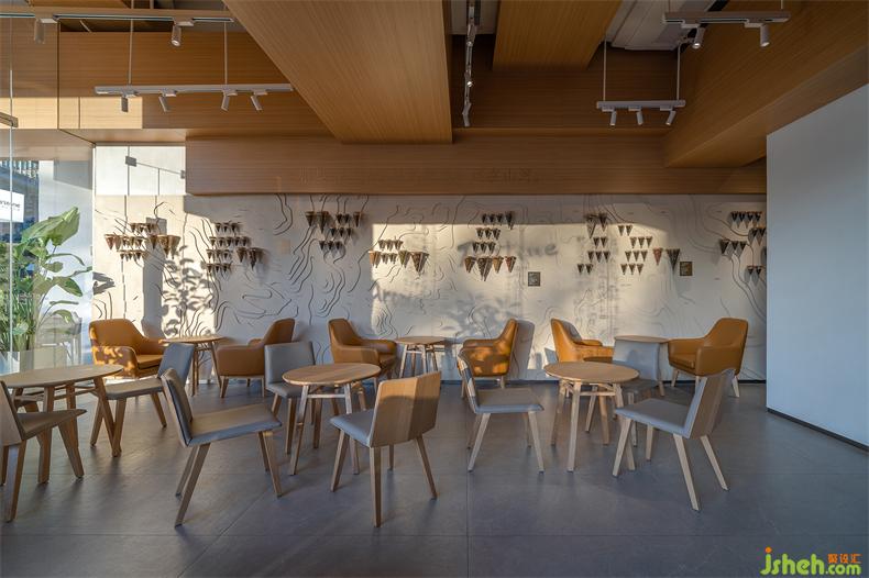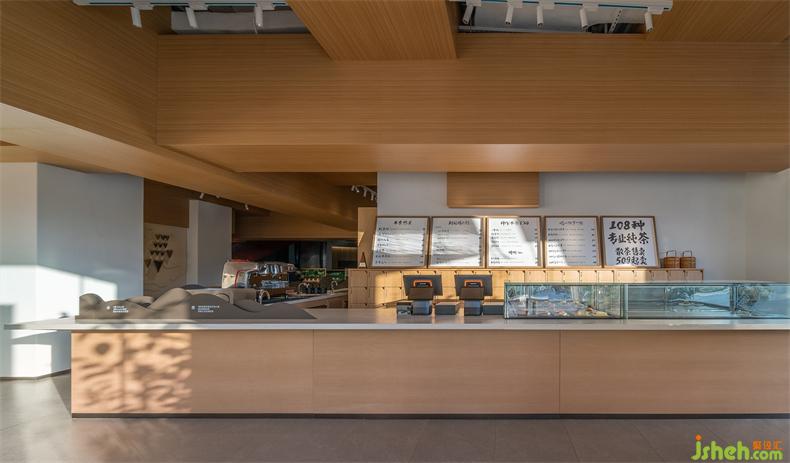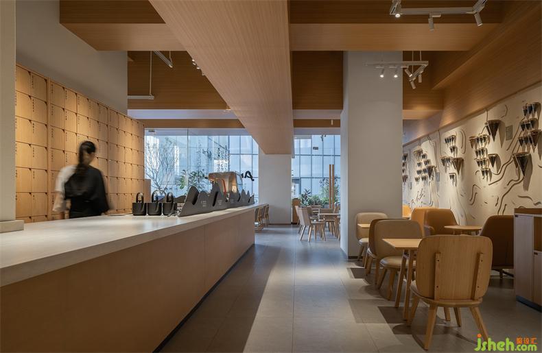 吧臺仍然是空間的重心,山形擺件形成獨特的吧臺景觀,與對面“茶色大地”裝置墻形成整體,集合中國茶山人文地理、茶樣及風(fēng)土樣本,品牌方用裝置藝術(shù)化的語言表達(dá)出當(dāng)代中國茶的博大精深。