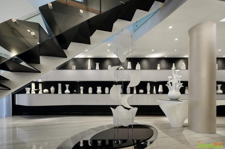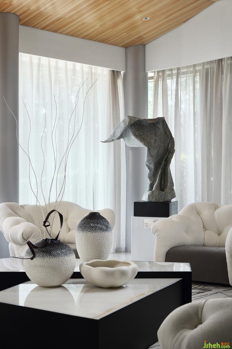 冷冽克制的黑白灰下,強(qiáng)烈的幾何構(gòu)成,形成極具現(xiàn)代感的空間基調(diào),來自臺(tái)灣著名藝術(shù)家許東榮先生的雕塑作品,為冷靜的空間,注入了一絲不羈的靈魂。