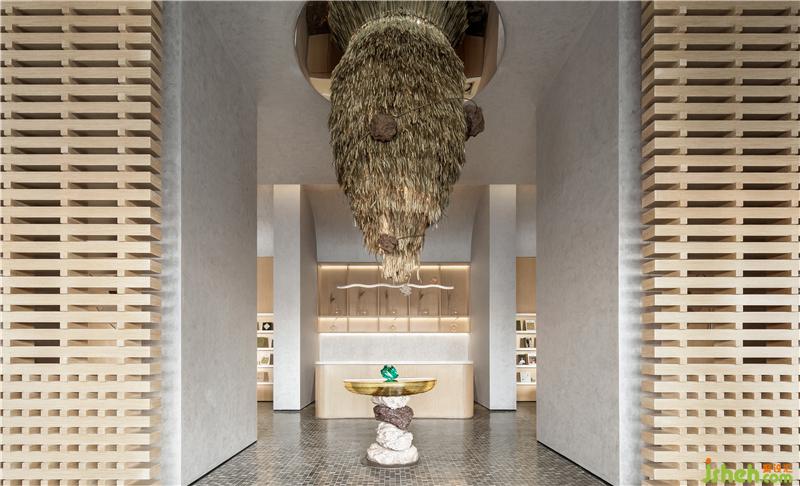 材料的相互和諧、層疊、呼應(yīng),為情緒的緩釋、升起與流轉(zhuǎn)提供了指引。本案選用了大量具有天然親和性、生命力的材質(zhì)及肌理,以喚醒知覺(jué)、觸覺(jué)、嗅覺(jué)等感官的豐富體驗(yàn)。石材廢料再利用的碎石馬賽克地面,迥別于標(biāo)準(zhǔn)大理石或瓷磚的冰冷感,更為斑斕靈動(dòng)。