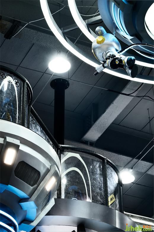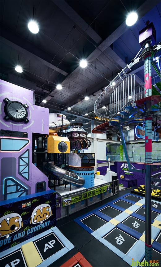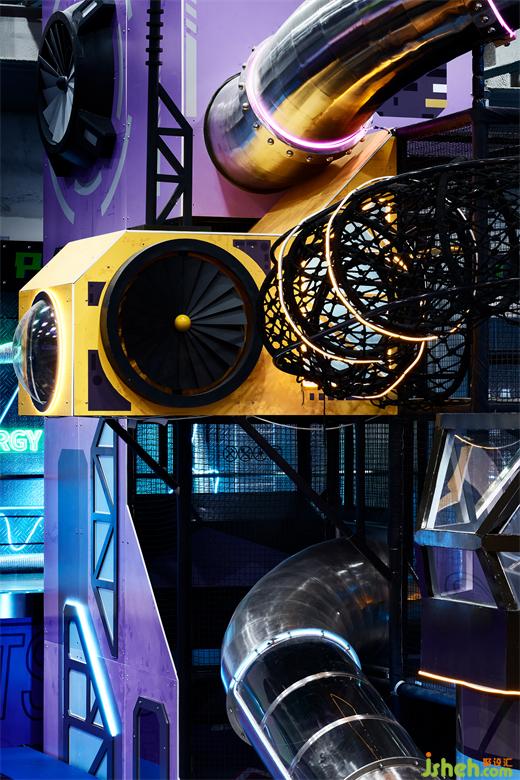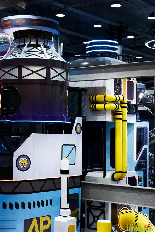 在整個一票制的區(qū)域主體中心位置是一個下沉的挑空空間,我們利用這個空間的層高搭建了一個元宇宙城堡,潮玩運動空間站設計通過自動感應的未來之門進去其中,在趣味性、挑戰(zhàn)性、體能性穿插的功能設計之中,體驗者登頂城堡最高處的風景。