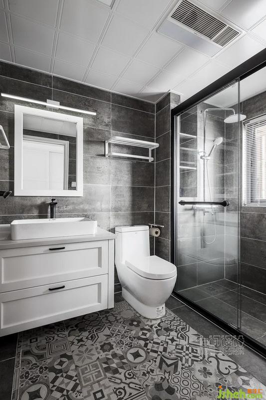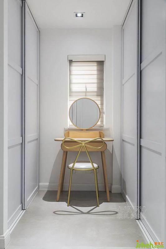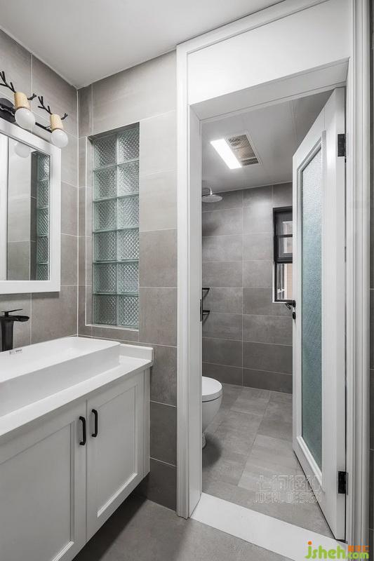 次衛(wèi)生間在過道中間,采光不是太好,所以干濕分區(qū)的同時(shí),室內(nèi)設(shè)計(jì)師用玻璃磚代替實(shí)體墻,盡可能讓自然光照射進(jìn)空間內(nèi)。