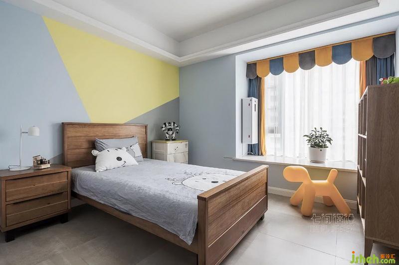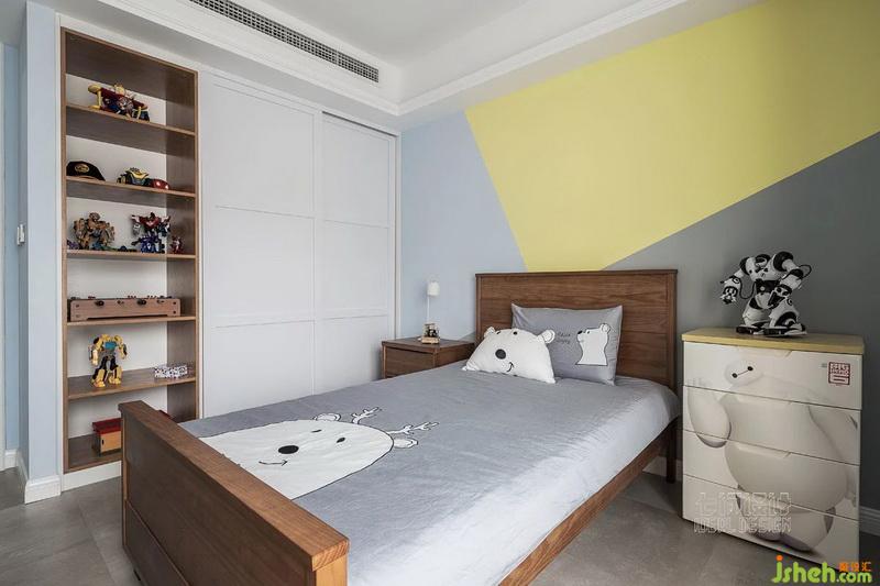 兒子的房間不想做得復(fù)雜,但又不想要太單調(diào),所以室內(nèi)設(shè)計(jì)師采用了乳膠漆分色的方式,低明度的色塊組合既達(dá)到活躍空間的效果,也能營造比較柔和的效果。同時(shí),兒童房除了整體的新風(fēng)設(shè)備外,還單獨(dú)增加了一臺(tái)新風(fēng)機(jī)。