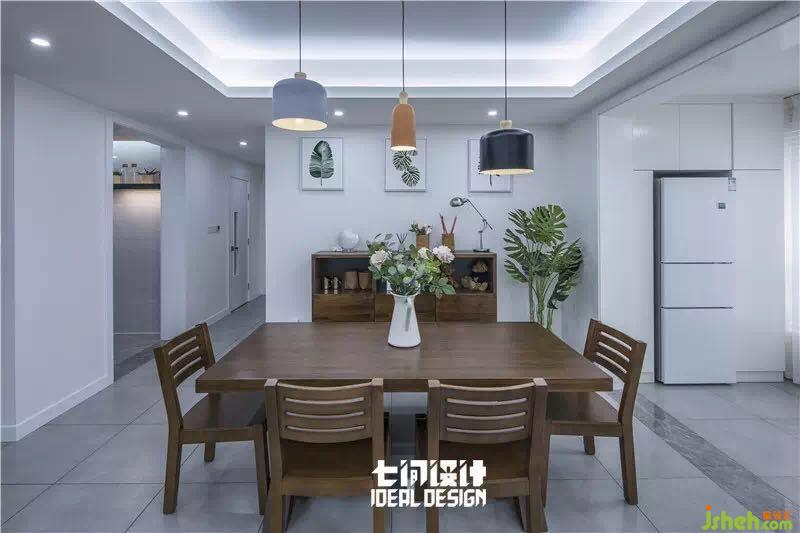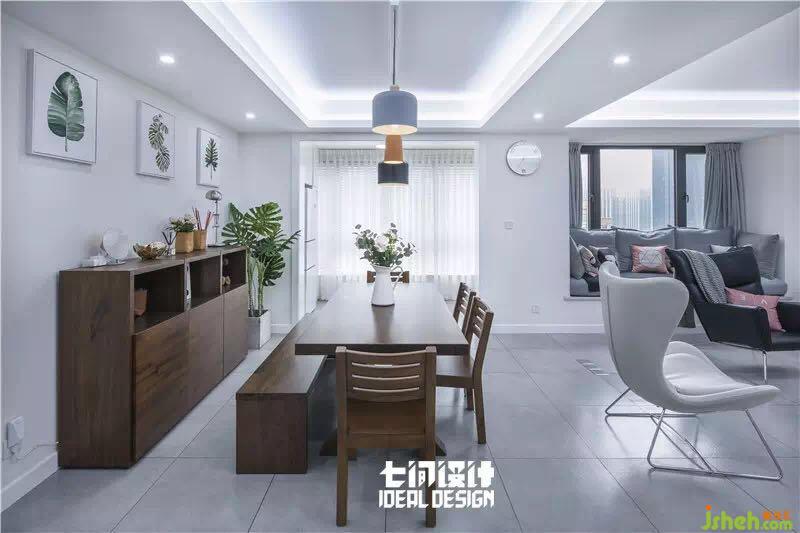包括客廳、餐廳、廚房等在內(nèi)的公共區(qū)域,被打造成了開放式空間??蛷d并不以沙發(fā)為中心,富有設(shè)計(jì)感的單椅錯落擺放,將飄窗布置成沙發(fā)的樣子,營造出輕松自在的氛圍。
