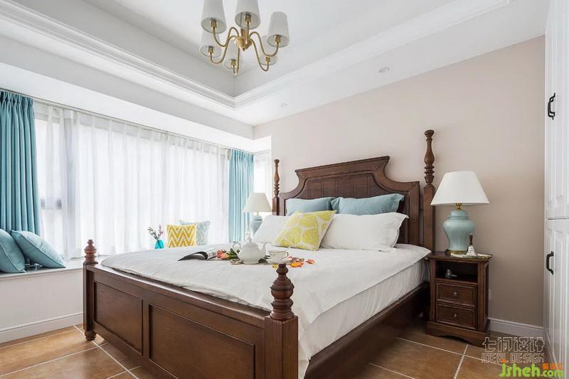 卡其色背景墻打底,搭配胡桃木家具,室內(nèi)設(shè)計師以藍(lán)色和黃色調(diào)和,延續(xù)公共空間的色彩搭配,但保持更簡潔的視覺,營造更舒適的睡眠環(huán)境。
