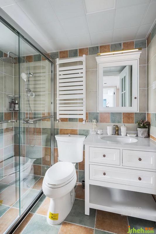 淋浴隔斷將浴室進(jìn)行干濕分區(qū),變換大小的拼色磚鋪貼方式,讓這個空間視覺上不再狹小,顏色選取了客廳的組合搭配。