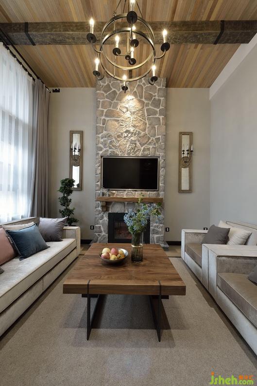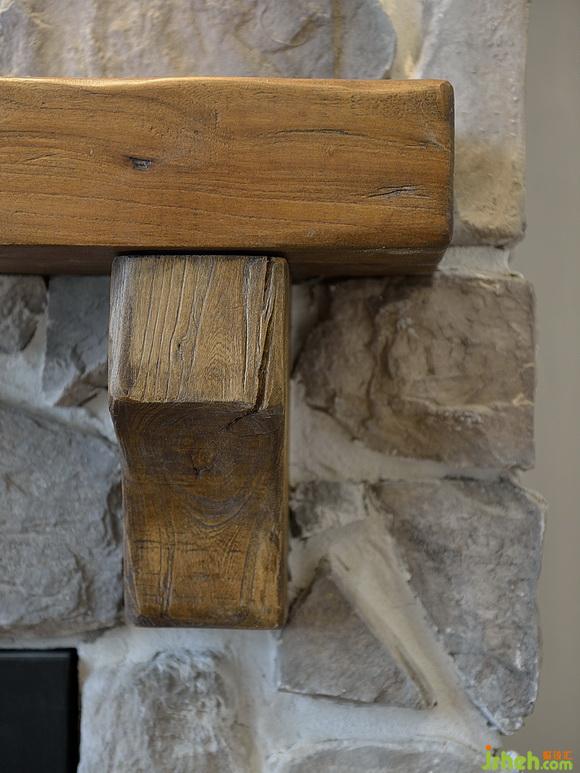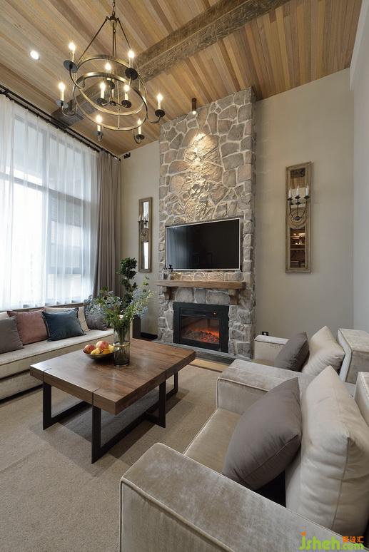 客廳壁爐造型比較簡單,粗獷的文化石跟做舊的實木裝飾,看上去也非常協(xié)調,簡單大方