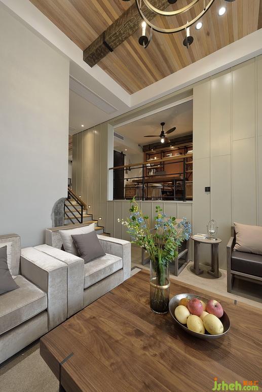 客廳的上方是敞開式書房,讓兩個空間相互參透,這樣采光跟視覺空間都會提身。