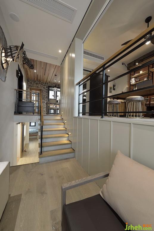 客廳通往選用帶點工業(yè)風的樓梯欄桿,室內設計師在踏步上設計了踏步燈光,解決了樓梯照明,還營造了比較溫馨的氛圍,在書房跟客廳敞開位置設計了電動卷簾,解決書房獨立使用時的需求。