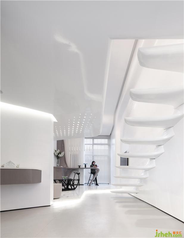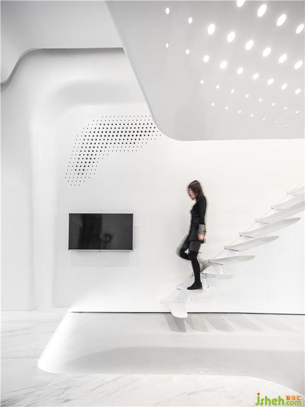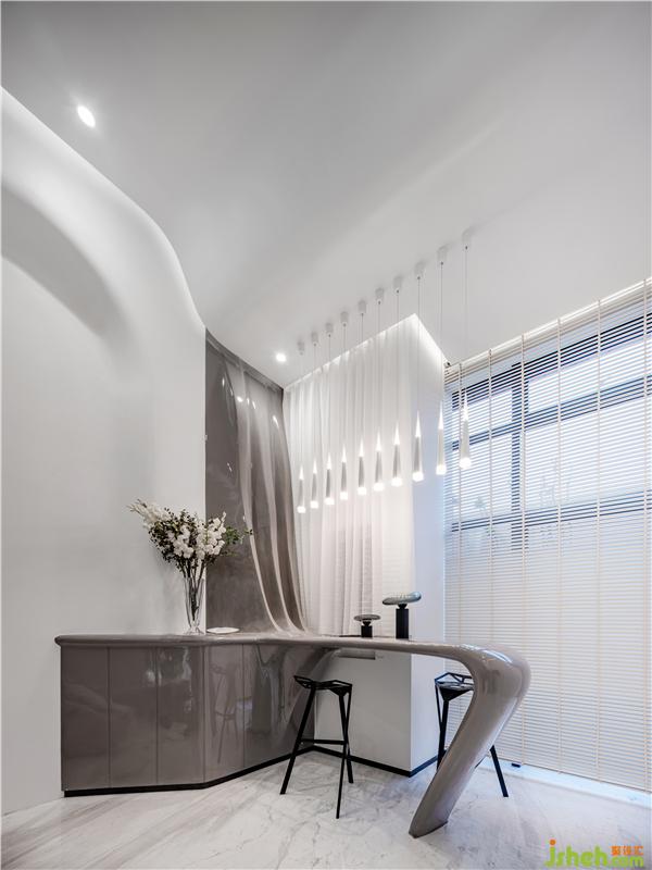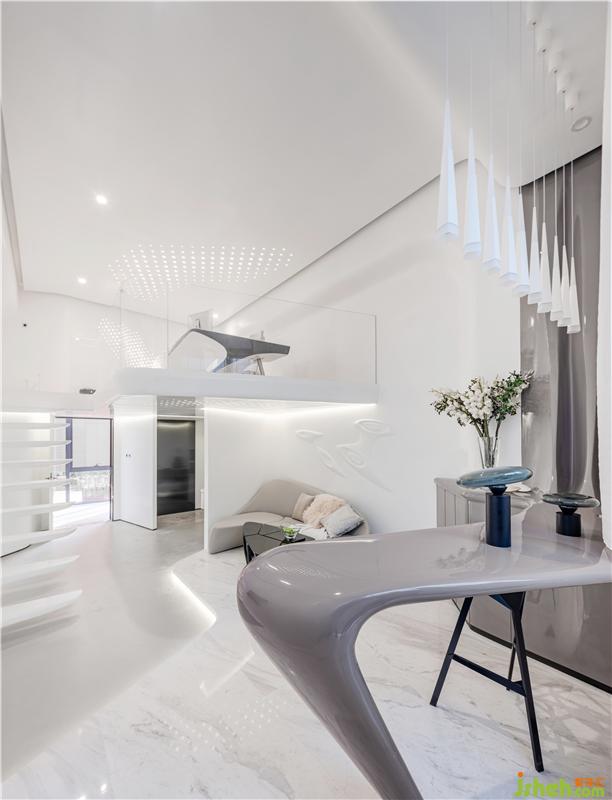 LOFT樣板間運(yùn)用扎哈的異形造型營造時(shí)尚、品質(zhì)的超現(xiàn)代生活意境,實(shí)現(xiàn)了小戶型里的豪宅夢。連接夾層的“魚骨樓梯”和“流水瀑布吧臺”是本案的亮點(diǎn),藏山水之美,于一室之中,一體成型的雕塑感造型,增加了空間的藝術(shù)氣質(zhì)。室內(nèi)設(shè)計(jì)師