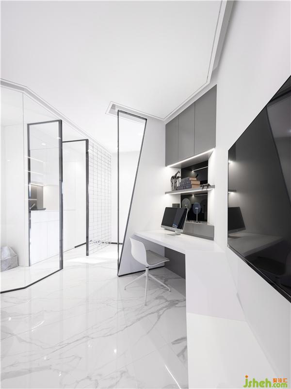 在空間布局上運(yùn)用空間切割法,利用墻體、裝置將空間從物理上劃分為若干區(qū)域。我們前衛(wèi)性的采用斜面切割法,旨在呈現(xiàn)出更靈動(dòng),更有趣味性的對比沖擊感和意蘊(yùn)感。斜面切割依墻體而建儲藏室、書架、暗柜,為居室?guī)砹烁嗟膬Υ婵臻g,營造純粹、清晰的居住環(huán)境。最后,曲線墻體人為延長了室內(nèi)動(dòng)線,巧妙利用感知錯(cuò)覺,豐富空間層次感和秩序感。