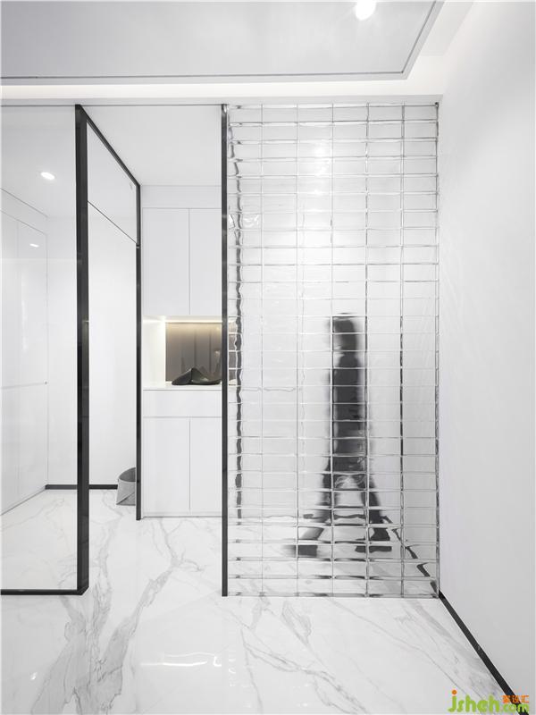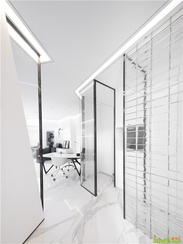 辦公樣板間運(yùn)用了現(xiàn)代構(gòu)圖的方式,突破傳統(tǒng),通過立體幾何營造時(shí)尚、品質(zhì)、靈活的居家辦公場景。空間材質(zhì)運(yùn)用仿魚肚白的大片地磚、熱熔玻璃磚、黑鏡、灰色烤漆板,呈現(xiàn)光反射、折射的虛境空間,增加空間的品質(zhì)和光感。室內(nèi)設(shè)計(jì)師