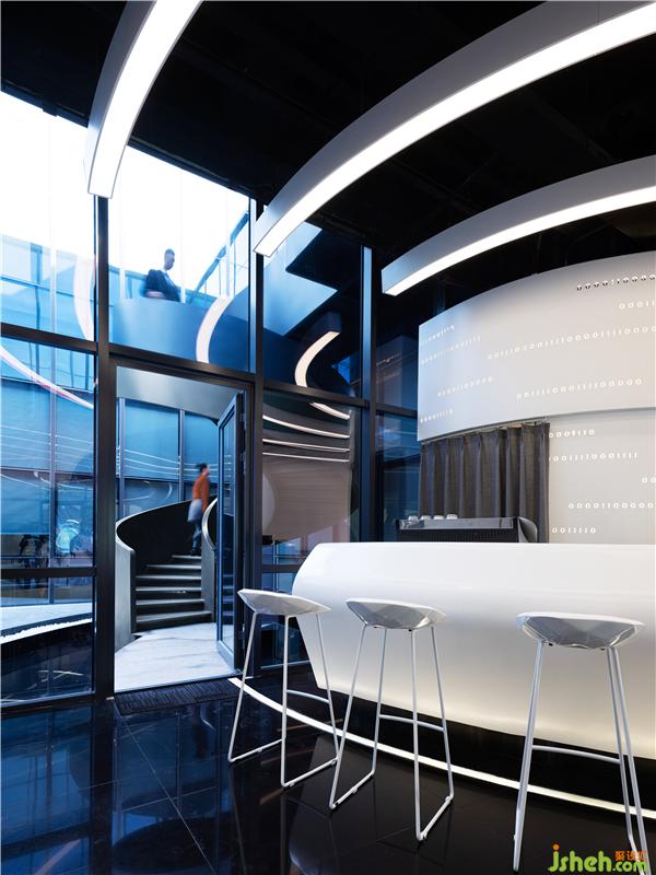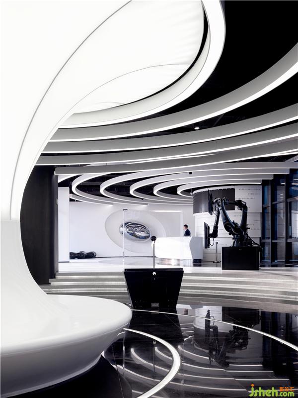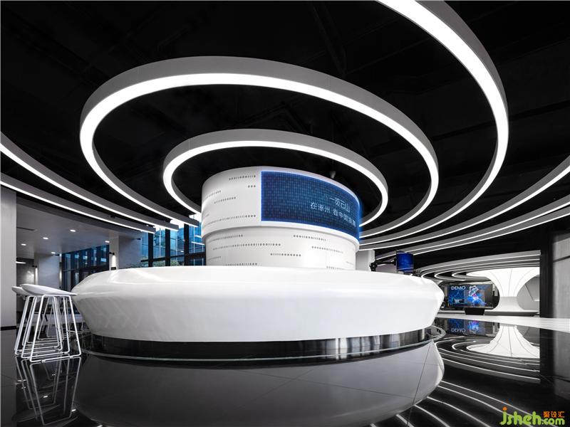 本案的空間形態(tài)設(shè)計(jì)是如何體現(xiàn)浪潮大數(shù)據(jù)的科技特性呢?空間又是什么呢?空間設(shè)計(jì)師李怡明、周全賢是這樣詮釋的:大數(shù)據(jù)是流動的匯聚、是像云一樣虛擬的運(yùn)算,而空間則是視覺感觀后的心靈意境。帶著這樣的理解,設(shè)計(jì)團(tuán)隊(duì)提取科技感的“二進(jìn)制”元素和“行云流水”的曲線空間造型,利用光和鏡面的反射營造科幻的大數(shù)據(jù)意境。