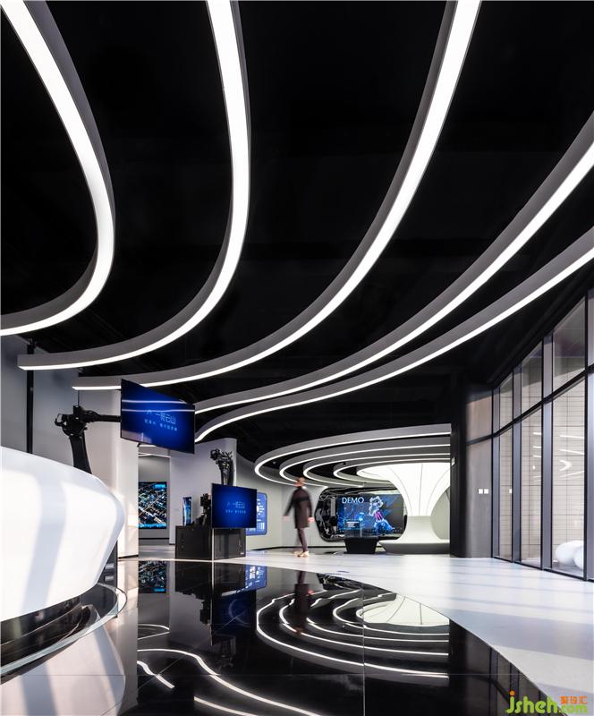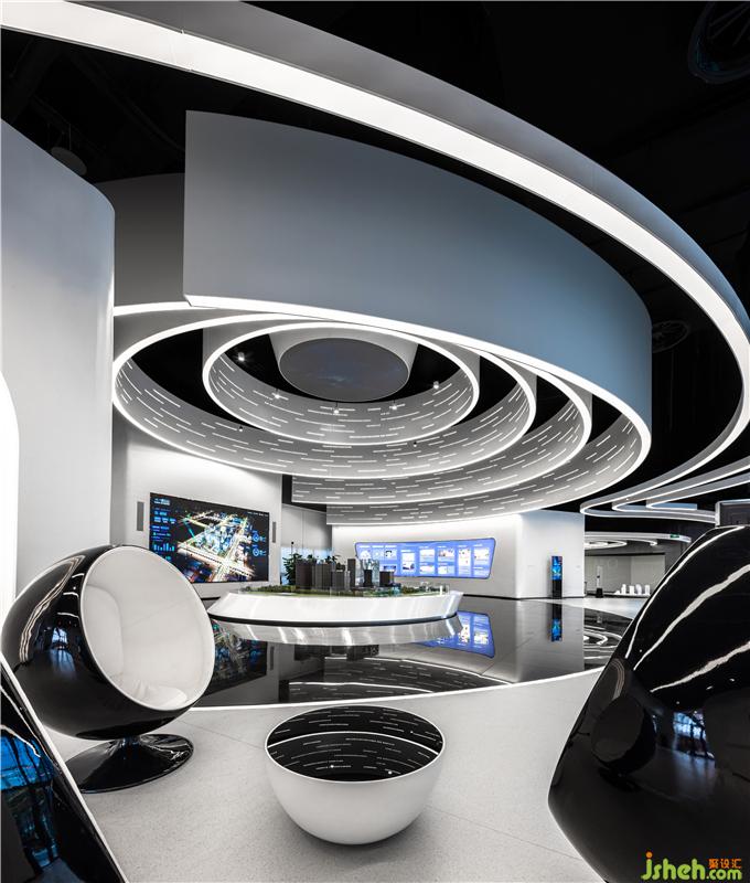 設(shè)計(jì)團(tuán)隊(duì)以科技未來感之折線作為設(shè)計(jì)元素,打造科技館式,體驗(yàn)式的營銷中心;以高科技為主軸,融入VR體驗(yàn)、3D幻影城市、全息投影、機(jī)械臂等技術(shù)和扎哈風(fēng)格的場景,營造科技與未來的視聽盛宴。
