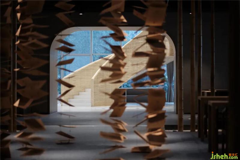 首層借鑒用中國(guó)古典院落布局,中軸對(duì)稱、方正嚴(yán)整的布局,植根于深厚的傳統(tǒng)文化,形成書院文化的底蘊(yùn)。并且每一本書都應(yīng)該可以很方便地被觸碰、翻閱,而非把書籍用作裝飾,這是對(duì)于書籍最基本的尊重。用薄木片串成的藝術(shù)裝置,形成書店的記憶,一人、一書、斑駁的燈光有一絲俠客氣氛。