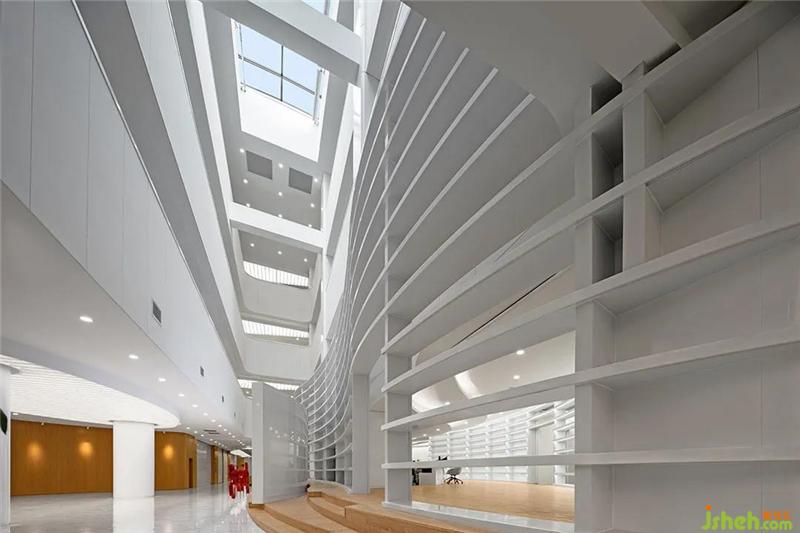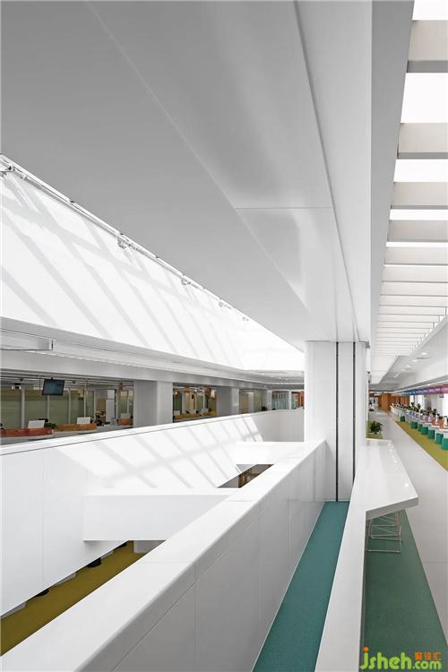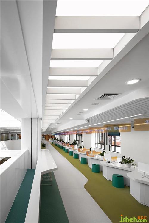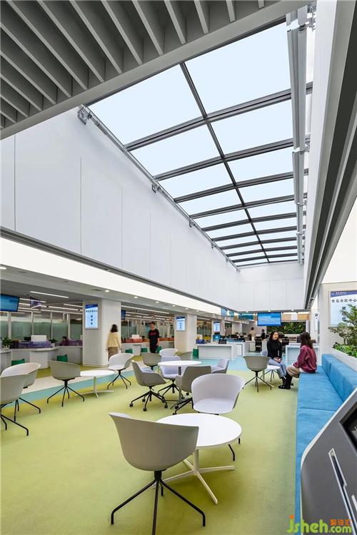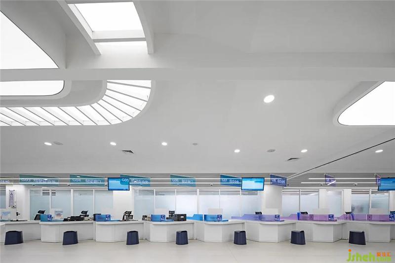 項(xiàng)目本身作為大型公共服務(wù)空間,職能空間本身已經(jīng)被賦予了“陽光”“開放” 的公眾印象和標(biāo)簽。因此充分的自然采光似乎是市民中心必備的精神氣質(zhì),為了契合公眾對(duì)市民中心的潛在期待,我們?cè)谠虉?chǎng)建筑的三個(gè)中庭上設(shè)置了大面積的天窗,讓陽光能夠通過中庭灑向室內(nèi)。通過重新規(guī)劃墻體分隔和豎向交通讓室內(nèi)空間獲得更充分的自然采光,配合人工光帶的分布,讓空間符合市民對(duì)大型公共服務(wù)空間的期待。
