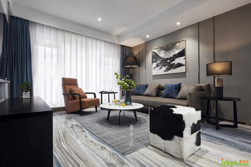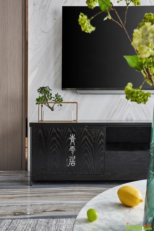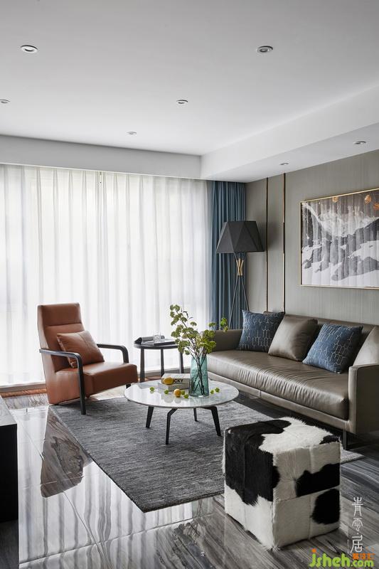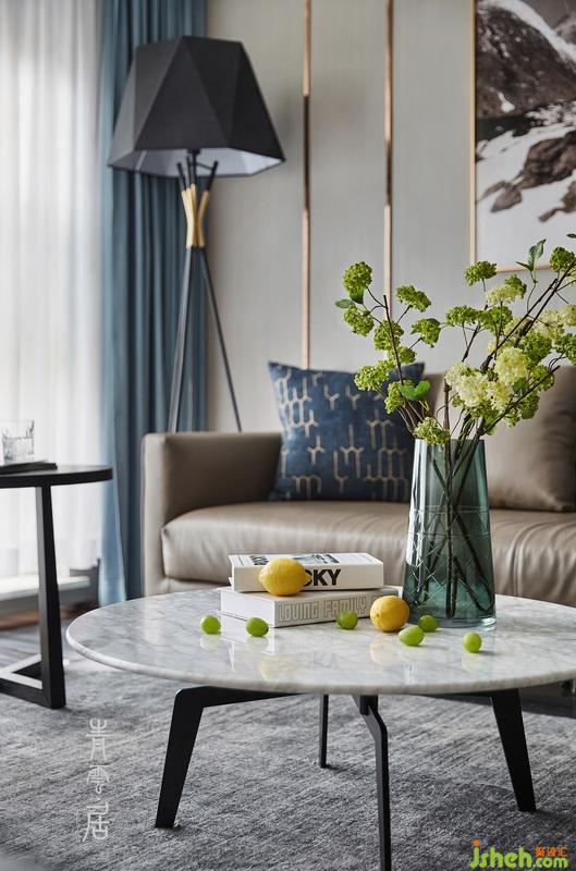 ▲本案例將藍(lán)與白,黑與咖等顏色不同程度的對比與組合發(fā)揮到極致,與光線相互輝映,交織出詩畫般的情景。地面鋪設(shè)藍(lán)金沙仿木紋地磚,電視背景墻室內(nèi)設(shè)計(jì)師運(yùn)用大理石材天然紋路,進(jìn)行對紋設(shè)計(jì)手法把相同紋理的大理石對稱拼接,有著強(qiáng)烈的張力與表現(xiàn)力。