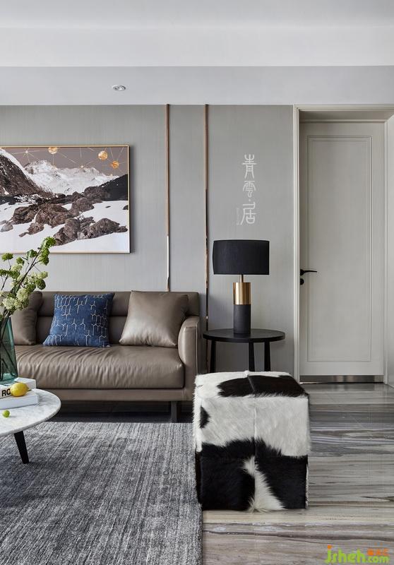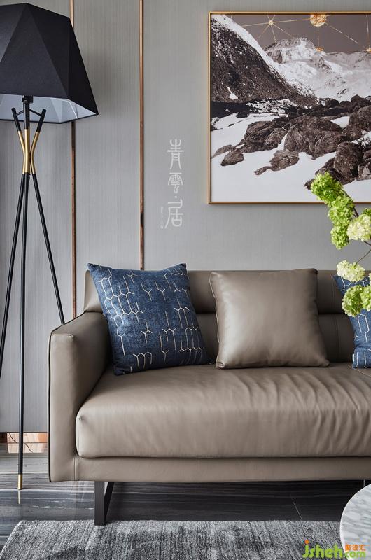 ▲沙發(fā)背景墻與踢腳線室內(nèi)設(shè)計(jì)師選用了金色不銹鋼線條,輕松營造現(xiàn)代輕奢感,沙發(fā)背景貼淺灰色墻紙,咖色皮質(zhì)沙發(fā),簡潔而不失時(shí)尚。