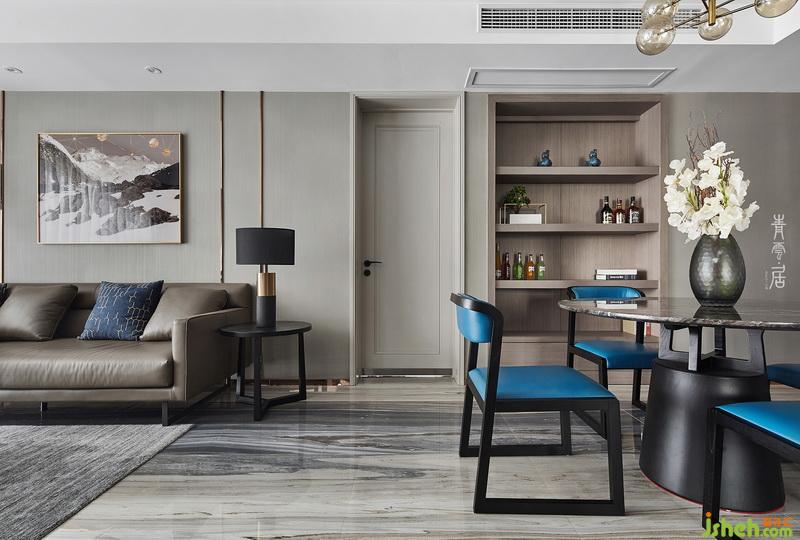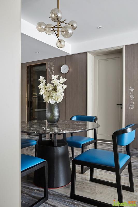 ▲極具包容感的灰色調(diào)彰顯出都市生活的現(xiàn)代感,餐廳中孔雀藍(lán)座椅于無形之中凝聚優(yōu)雅風(fēng)范,用灰色調(diào)的靜雅襯托孔雀藍(lán)的靈動,優(yōu)雅的花卉進(jìn)行點(diǎn)綴。充分利用空間打造入墻式餐邊柜,放上小物件,裝飾置物兩不誤。