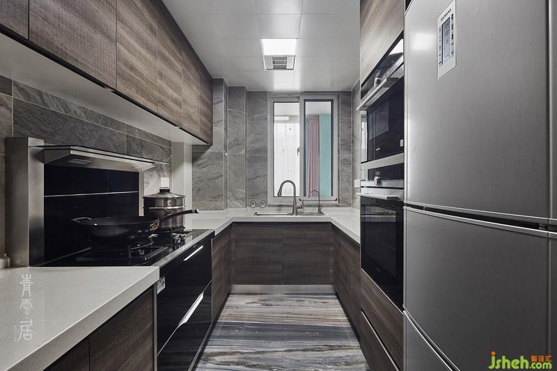 ▲顏色粗獷的木紋櫥柜與純白石英石臺面形成鮮明的對比,將右側(cè)墻面敲掉借用兒童房擴(kuò)大廚房面積,儲物量豐富的櫥柜解決了各種物品的收納功能。