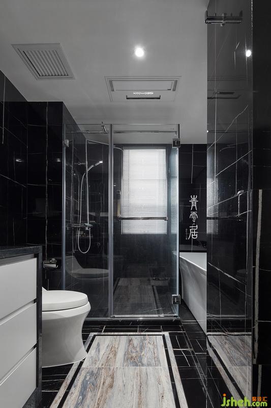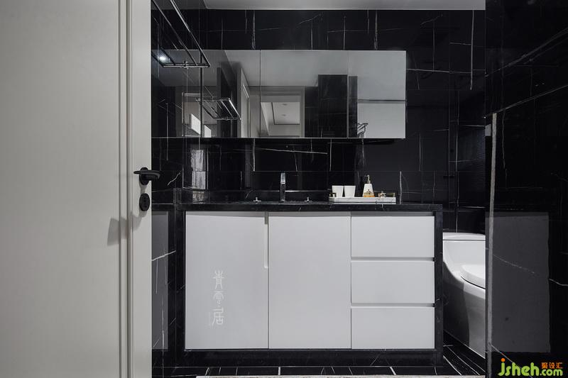 ▲純黑色系的衛(wèi)生間會不會太酷?在整體色調(diào)上,大面積的黑色大理石紋墻磚,搭配白色浴室柜效果非常的出色,起到瞬間顛覆傳統(tǒng)衛(wèi)生間風(fēng)格的作用,酷的沒道理。