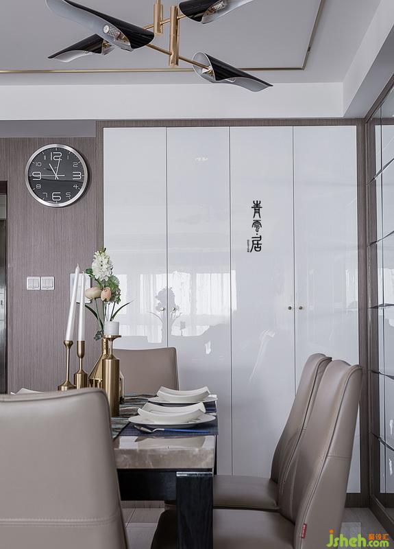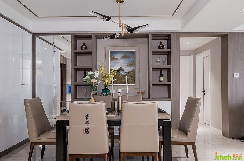 餐邊展示柜設計公司沿用了客廳的主題,達到視覺上的統(tǒng)一感,不僅從色彩上營造出和諧感,一旁的鏡面讓餐廳在橫向上有延伸空間的視覺效果。