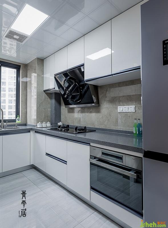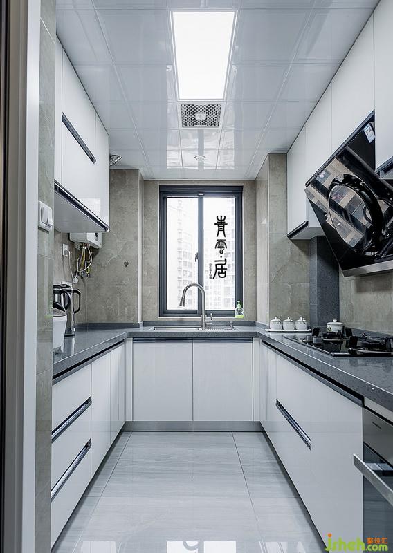U字形廚房區(qū),設計公司定制了整面的廚柜,將廚房雜物收納妥當,即便是白灰色的簡單空間,也顯得清爽潔凈。