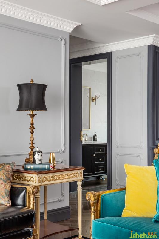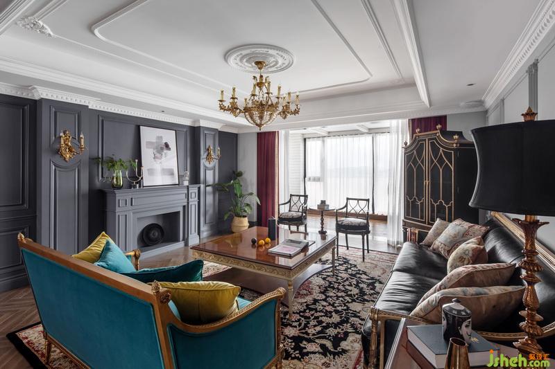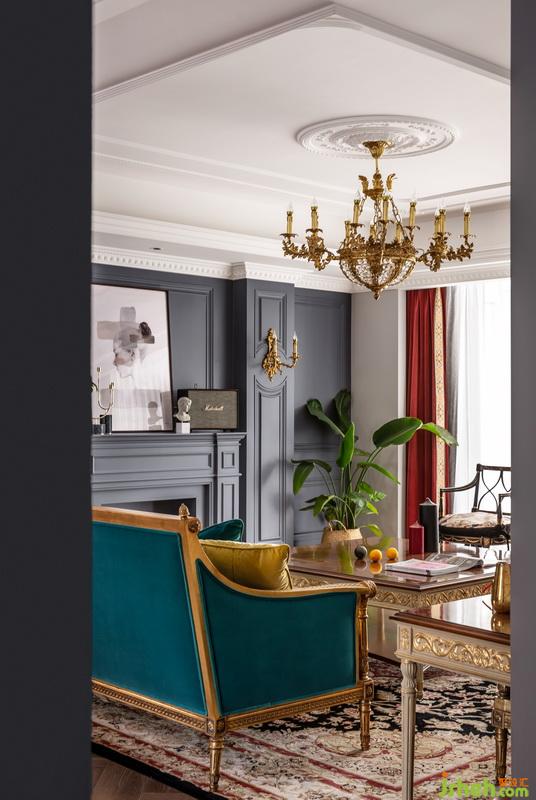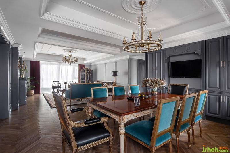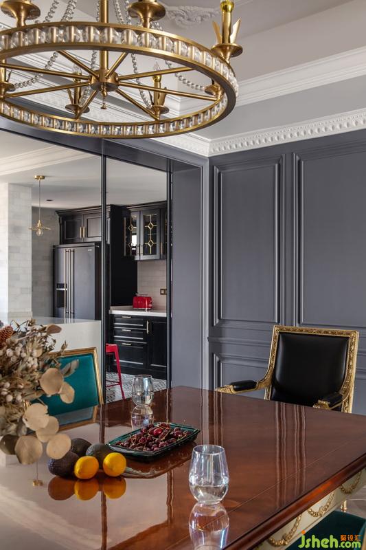 每個功能區(qū)之間的連接緊密又互相獨立,寬敞的客廳明亮通透,設(shè)計師選擇在同一個色彩體系系中,用孔雀藍進行延伸?;疑档倪吂裰虚g放置電視,懸掛著的金色水晶吊燈,充滿異域風(fēng)的花紋,讓復(fù)古與現(xiàn)代交替的魅力延伸至此。