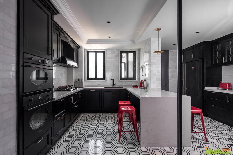 對于享受料理時光的屋主來說,寬敞的廚房區(qū)是必不可少的,從儲物柜到中島吧臺,都讓屋主可以自在的大展身手,室內(nèi)設(shè)計師利用透明的推拉門作為廚房與餐廳的分隔,廚房內(nèi)精致的黑色櫥柜與強烈?guī)缀螆D案地磚,紅色家具與電器點綴其中,營造出豐富的視覺感受。