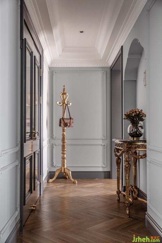 簡約典雅的走廊,溫柔的背景色,精致的石膏線條搭配華麗的家具,有著輕奢而不濃重,華麗卻不浮夸的美感。