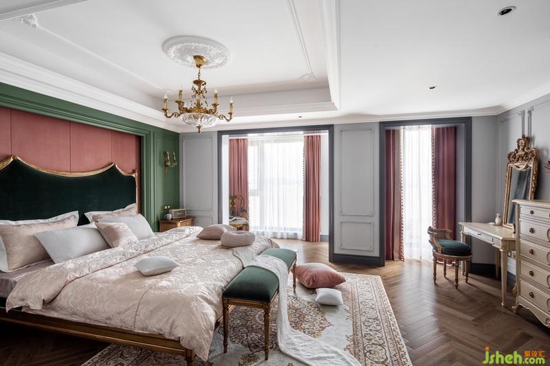 生活中最重要的地方當(dāng)屬臥室,它是我們最能放松下來享受的空間。主臥的視覺中心聚合在床頭背景,皮粉色與綠色形成撞色或互補色調(diào),給予最為直接的視覺沖擊,而純色床上織品與地毯又注入了一點柔美,起到很好的緩和作用。 大面積的落地窗更讓自然光線毫無保留的傾斜入室,獨特的色彩與微妙的色調(diào)形成了一種平衡與和諧。