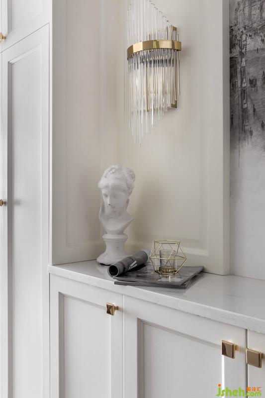 玄關(guān)用爵士白、金屬線條搭配現(xiàn)代水晶壁燈,讓人進(jìn)門時(shí)感受到輕奢又不過于浮夸,典雅中透著精致。