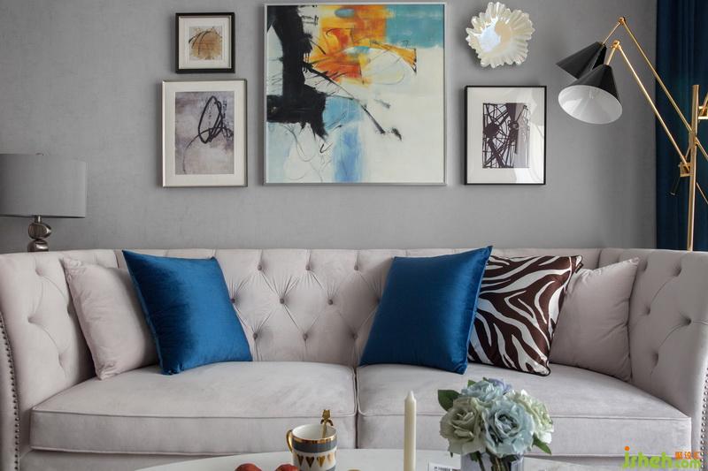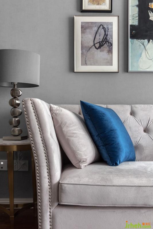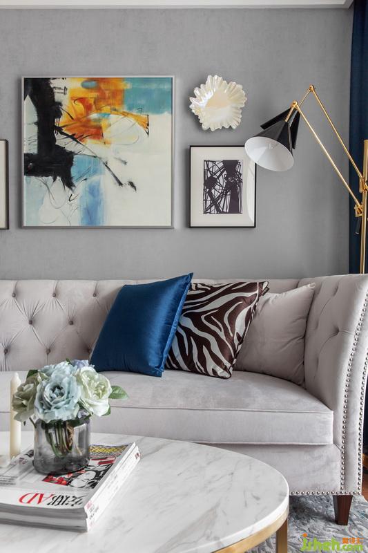 裝飾畫顏色與抱枕、立燈、金屬上下呼應(yīng)。