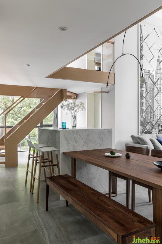 實(shí)木家具具有獨(dú)特清晰的紋理,散發(fā)著木材特有的香氣和來自森林的自然氣息。注重質(zhì)感的白色大理石吧臺(tái),打破空間,卻又不喧賓奪主,很好的融入其中。