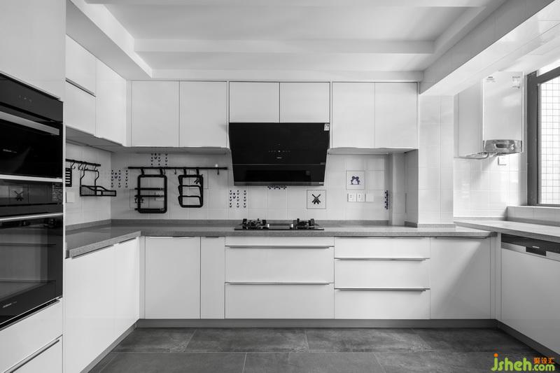 廚房的設(shè)計(jì)選材和色彩搭配上,注重實(shí)用與美觀并存法。廚房原槽鋼鋪設(shè)的假梁保留,視覺上起到增加層高的作用。