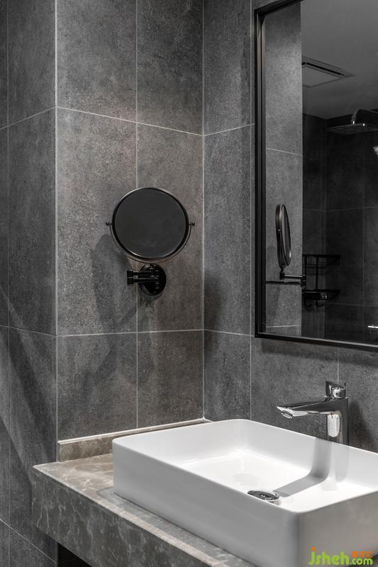 衛(wèi)生間整體統(tǒng)一的深灰色水泥磚,淋浴區(qū)地面用了大理石拉槽方便排水還增加防滑的功能