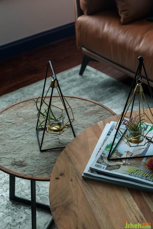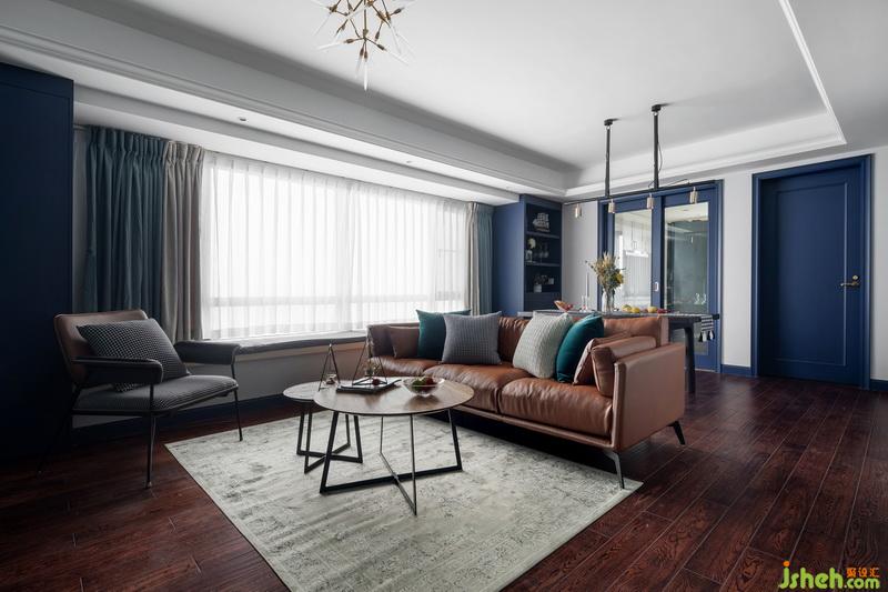 在家具的選擇上,設(shè)計(jì)師建議采用深色,因?yàn)榧揖叽蟛糠诸伾鹊匕鍦\的話,在視覺(jué)上很容易形成分離感。黃棕色沙發(fā)讓空間的色彩更加飽滿,變?yōu)閺?fù)古與時(shí)尚的結(jié)合。選擇細(xì)腿的沙發(fā)茶幾,增加線條感看上去更加舒服,避免顯得笨重。