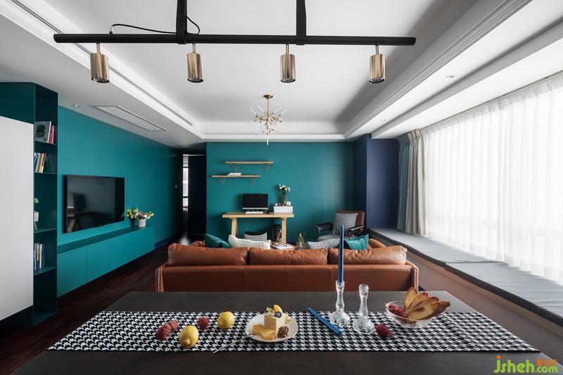 要如何挽救保留紅棕色地板后的壓抑感,設(shè)計(jì)師重在色彩搭配上面下功夫。使用冷色系如藍(lán)色墻面柜體等,形成強(qiáng)烈的視覺(jué)對(duì)比沖擊,讓我們視覺(jué)上移,減少地面對(duì)空間造成的壓抑。暖色系如地板沙發(fā)等紅棕色,中間色如黑白色。最后運(yùn)用這些進(jìn)行組合,得出一個(gè)高色彩對(duì)比度的作品。
