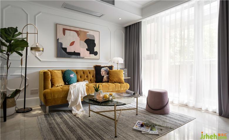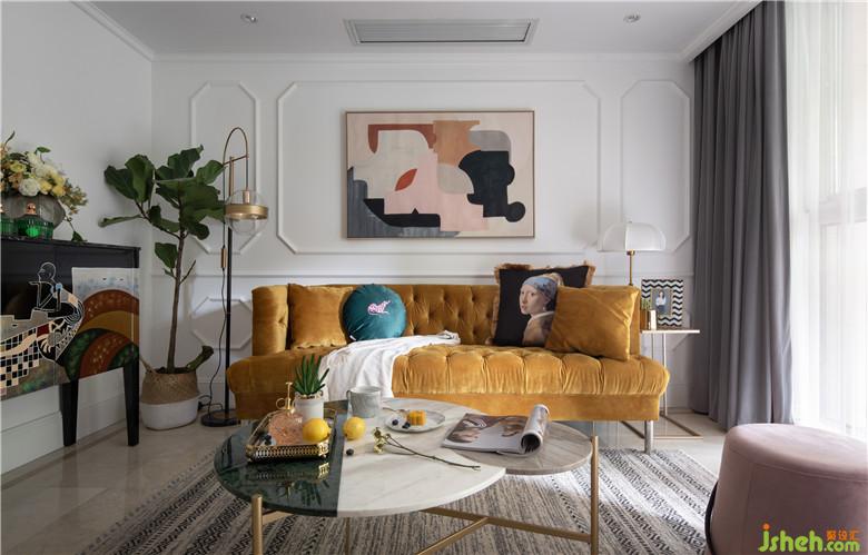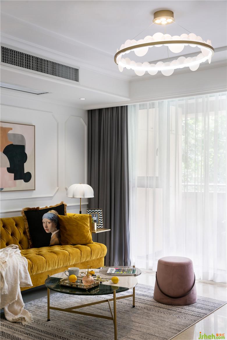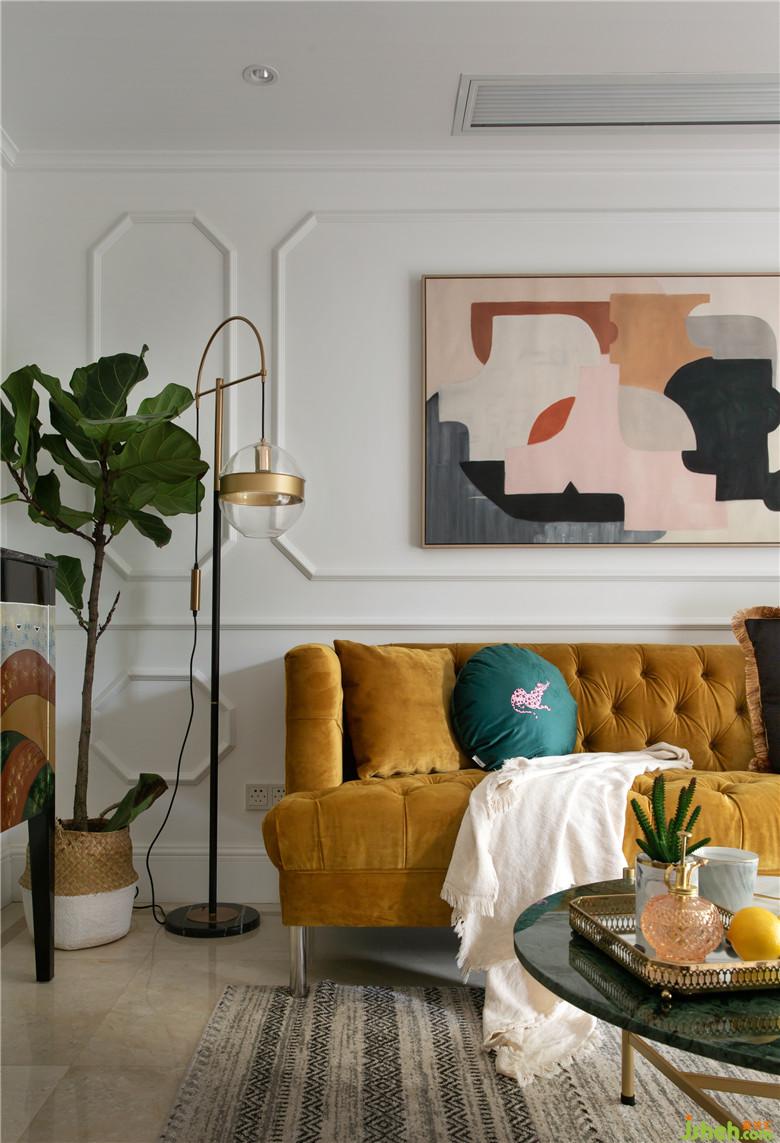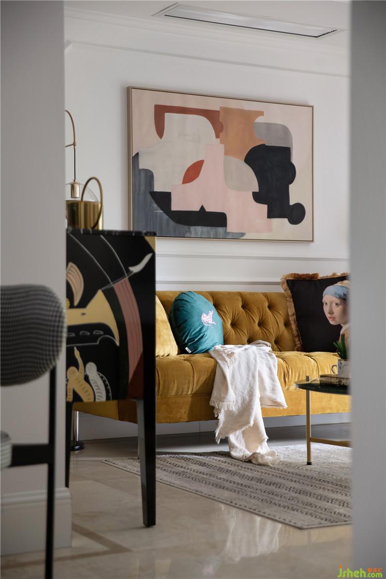 將墻面的墻紙和電視背景墻進(jìn)行拆除,墻面批膩?zhàn)雍笞隽司€條做裝飾。軟裝搭配上,亮黃色沙發(fā)是整個(gè)空間視覺的焦點(diǎn),裝飾畫與沙發(fā)邊柜風(fēng)格相呼應(yīng),充滿了摩登與藝術(shù)感。