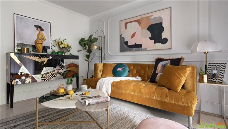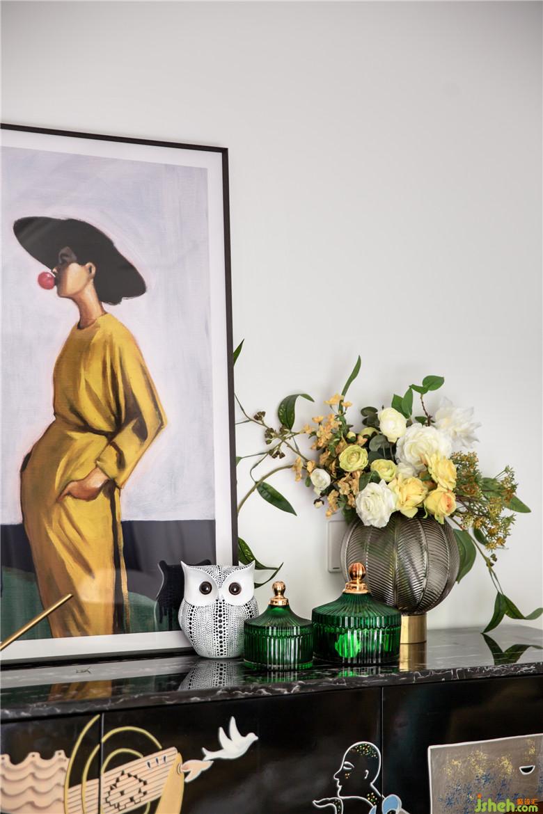 邊柜讓空間摩登個(gè)性,黃色裝飾畫與黃色沙發(fā)產(chǎn)生了呼應(yīng),精致的插花與小擺件,增添生活情調(diào)。原木色的地板、明黃色的沙發(fā)靠墊、以及邊桌上金色的裝飾擺件,都為這一空間增加了亮點(diǎn),色彩鮮明得可謂恰到好處。