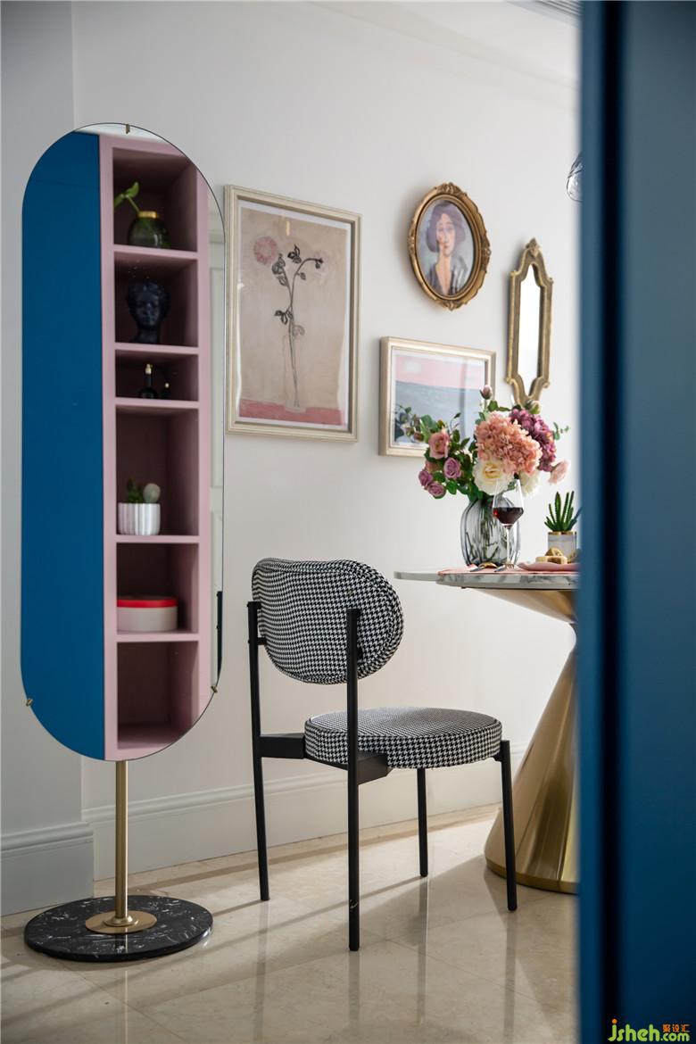 餐桌邊上的穿衣鏡,背后還可以掛放衣服,美觀與實(shí)用并存。