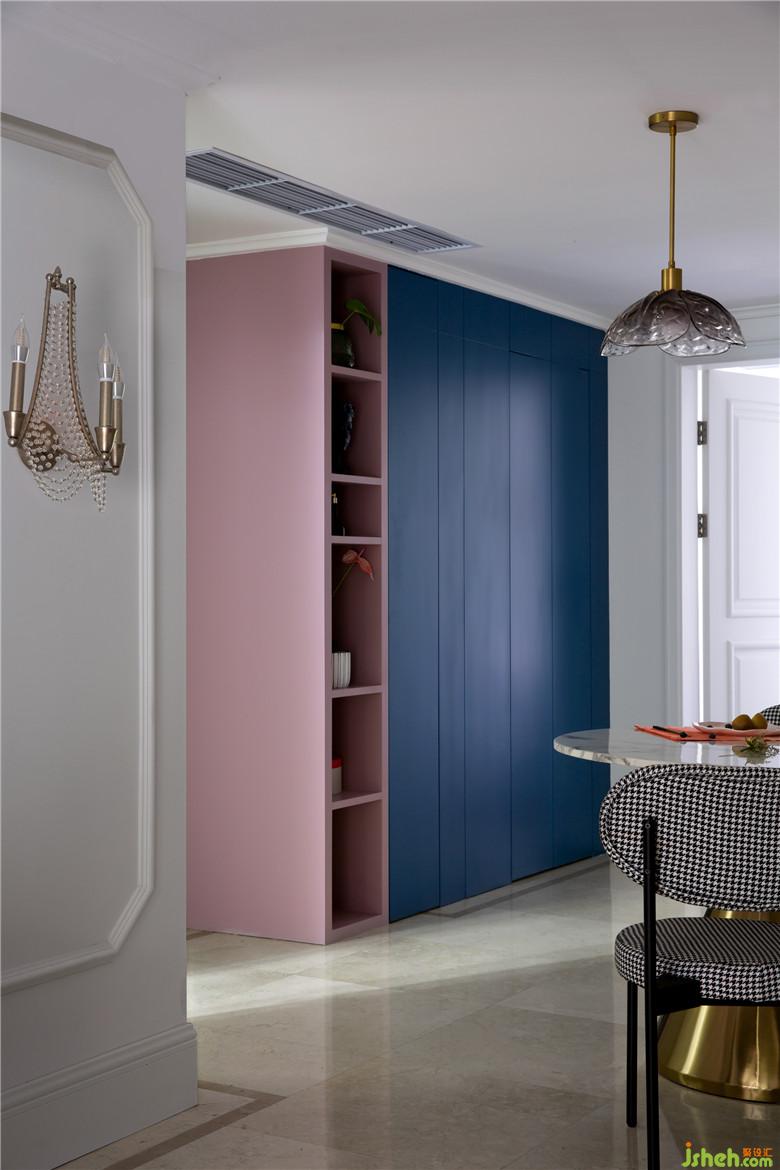 風(fēng)水大忌廚房門對(duì)應(yīng)入戶門,把廚房門改成的隱形門,這樣一進(jìn)門就是藍(lán)色的背景和粉色開放餐邊柜。