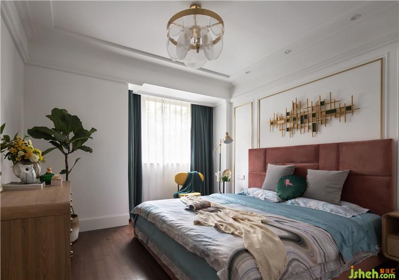 臥室的改造依舊是拆除了墻紙后做線條,和客廳不同的細(xì)節(jié)之處是多加了金屬線條做裝飾,搭配墻面金色掛飾有種不一樣的時(shí)尚感,墨綠色窗簾與皮粉色床頭軟靠撞色的處理十分驚艷。