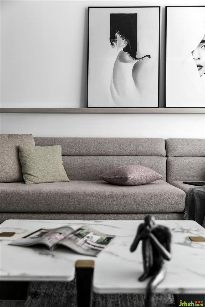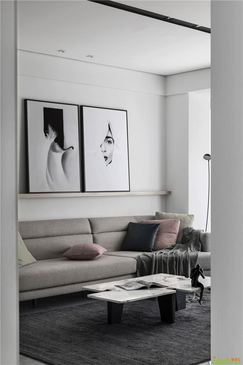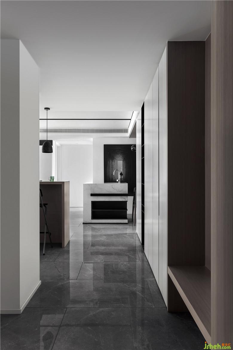 目之所及處,沒有多余矯飾,以現(xiàn)代主義的高度理性,減少陳設(shè)的構(gòu)成元素。黑白灰三色的冷靜氣質(zhì),在通道形成一路光與影的對比。入戶右側(cè)設(shè)立了一個(gè)帶卡座的換鞋柜。盡頭處裝飾畫則讓視覺延伸的更長。