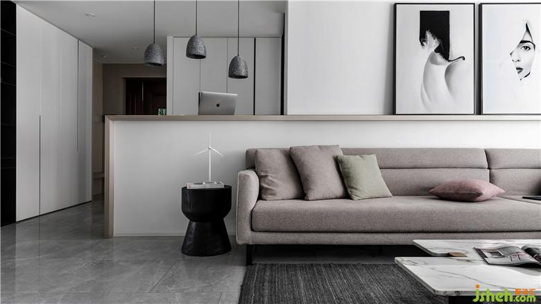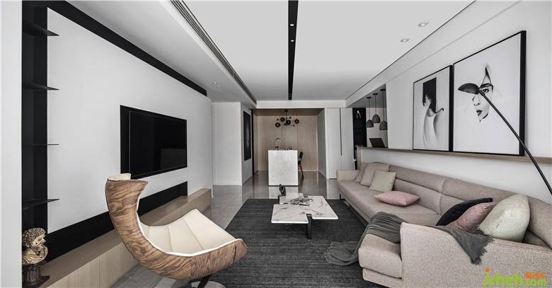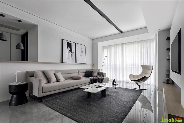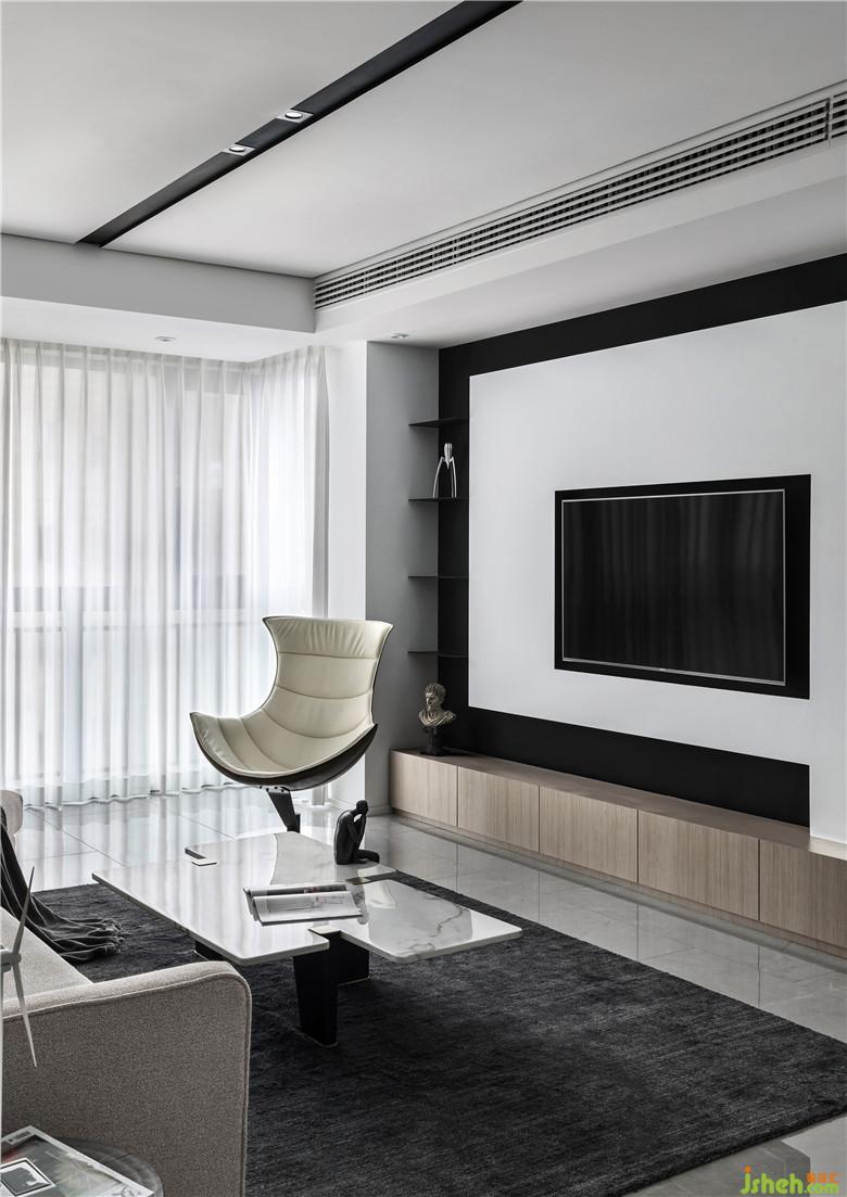 簡約頂面,中間凹槽刷黑色乳膠漆,增強線感,里面暗藏黑色射燈,給人硬朗的感覺。