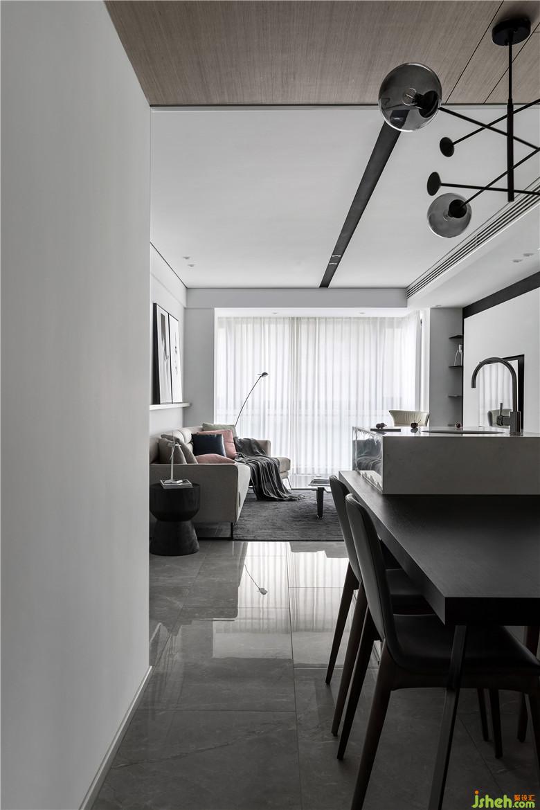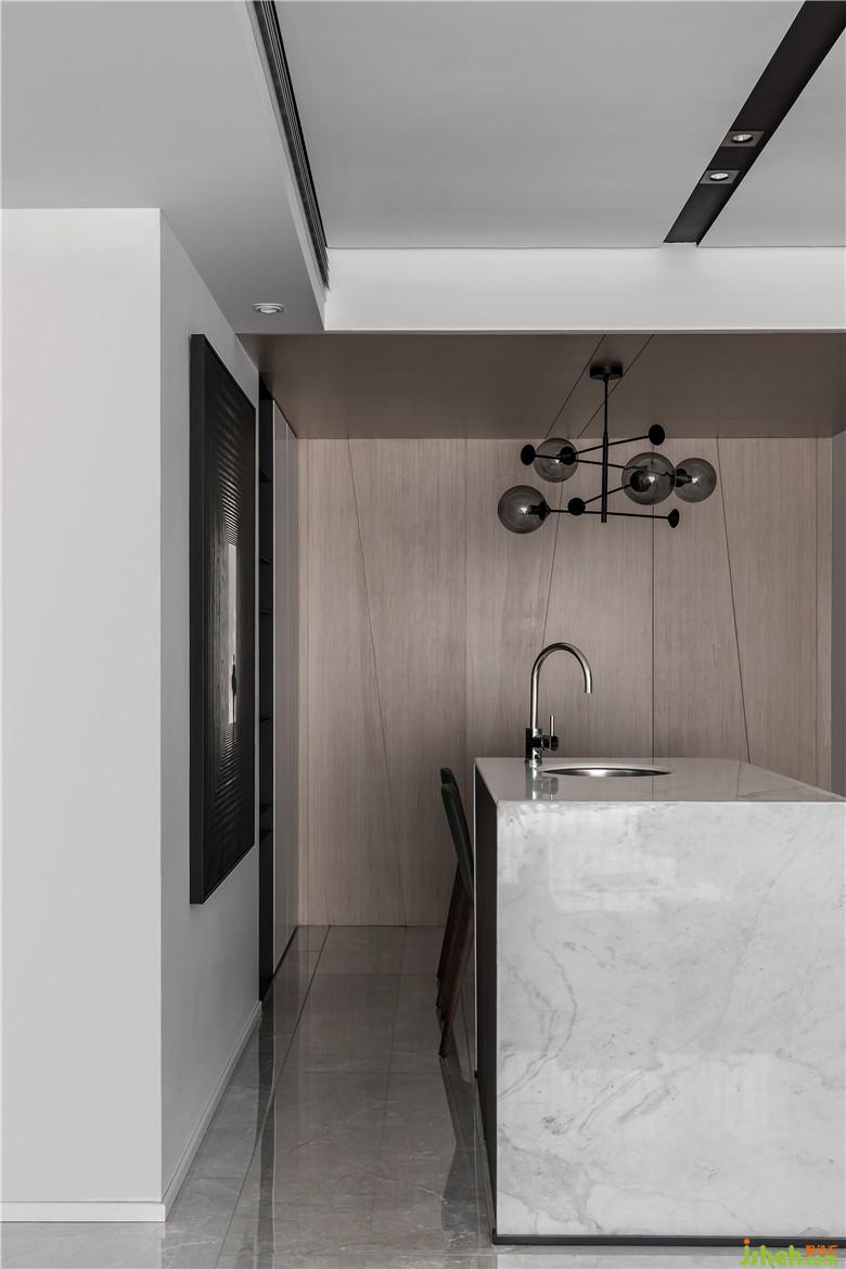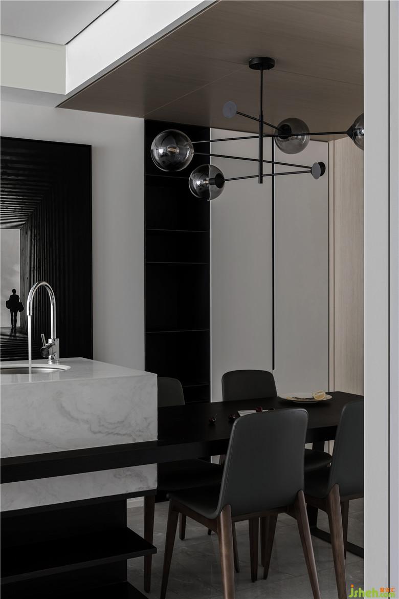 地面采用大理石紋理瓷磚,鏡面效果反射產(chǎn)生的光度對空間進行提亮,白色大理石、黑色鐵藝和原木隱形門隔墻,形成軟硬對比,并用黑色鋼板做壁龕用作收納空間,現(xiàn)場定制餐桌完美嵌合空間尺寸,整體搭配營造出簡約高級的用餐氛圍。