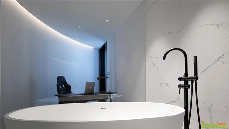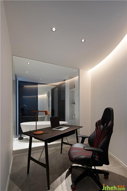 書房與浴缸也只有一“線”之隔,用玻璃隔斷,將主臥室的所有功能間都串聯(lián)起來,增大視覺空間。